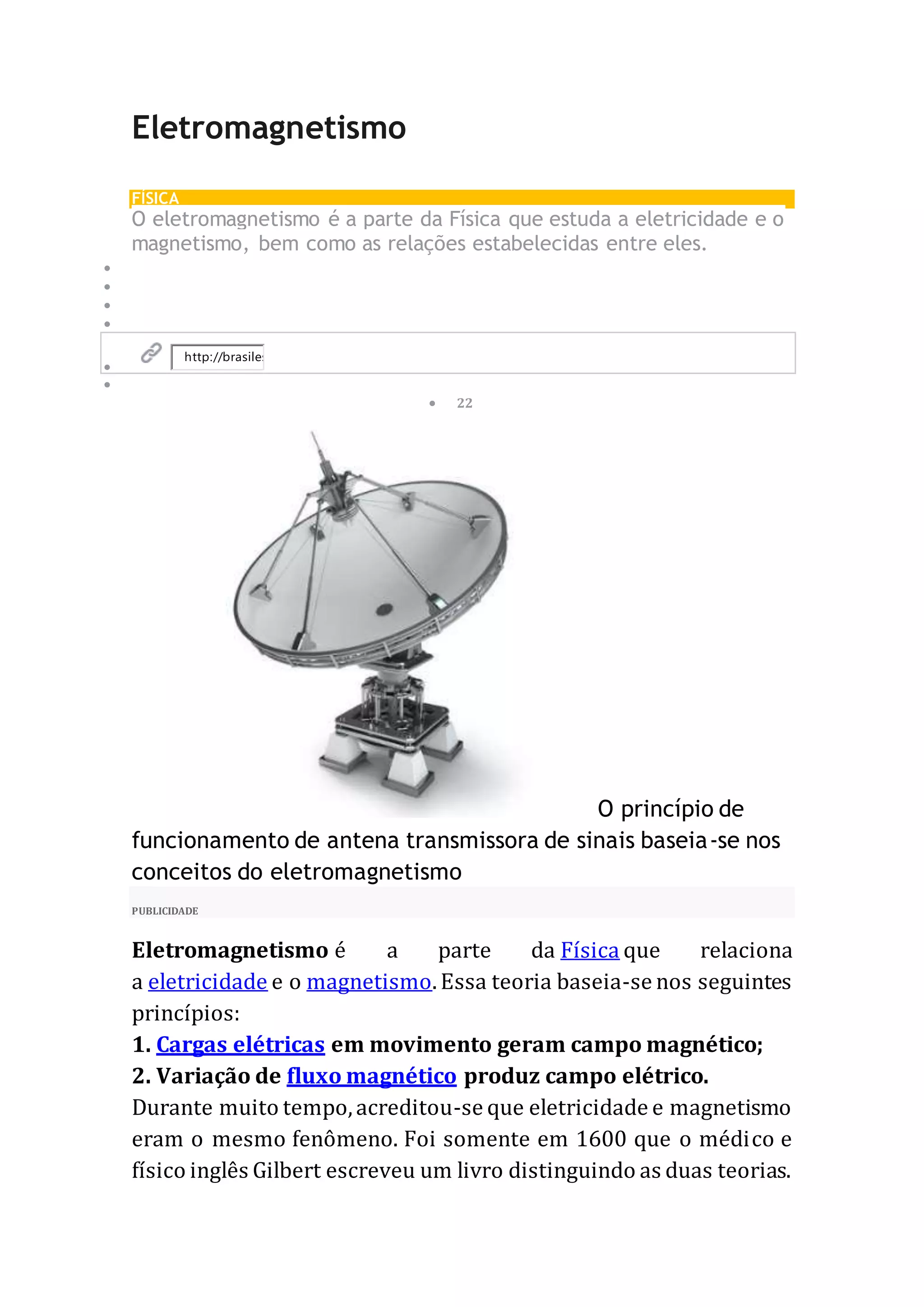 O eletromagnetismo estuda a relação entre eletricidade e magnetismo. Hans Christian Oersted demonstrou que correntes elétricas geram campos magnéticos, e Michael Faraday mostrou que variações em campos magnéticos induzem correntes elétricas. James Clerk Maxwell formulou as leis do eletromagnetismo.