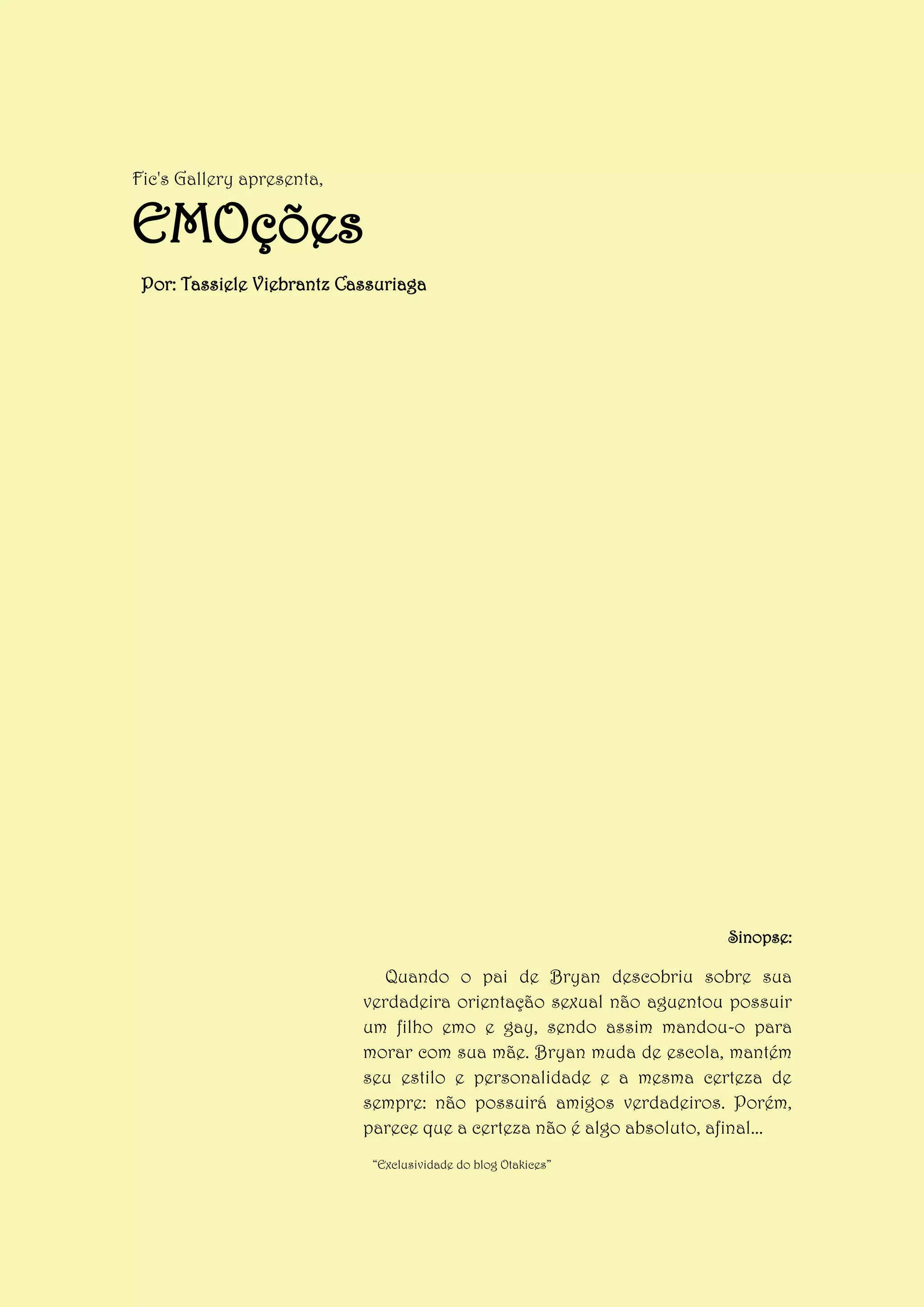 O documento apresenta o início de um capítulo de uma história sobre Bryan, um jovem emo e gay que se muda de escola após seu pai descobrir sua orientação sexual. Na nova escola, Bryan sente-se nervoso e recebe olhares estranhos dos outros alunos, mas conhece Pedro, um garoto bonito que se senta com ele e oferece ajuda com a matéria em que Bryan está atrasado.