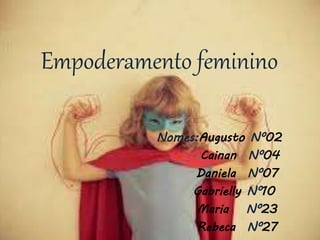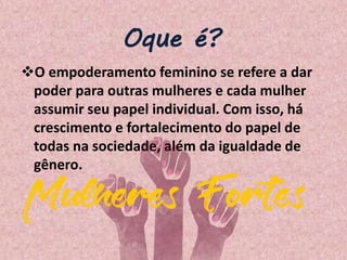 O documento discute o que é empoderamento feminino, sua relação com o movimento feminista e como promove a igualdade de gênero e o fortalecimento do papel das mulheres na sociedade como um todo.