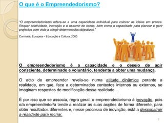 O documento discute o empreendedorismo, definindo-o como a capacidade de colocar ideias em prática de forma criativa e inovadora, assumindo riscos. Explora características do empreendedorismo em Portugal, como a apetência dos portugueses para criar negócios, embora muitos não concretizem as ideias devido a fatores como medo de fracassar. Fornece ainda um guia de 9 passos para criar uma empresa, desde conceber a ideia até iniciar a atividade.