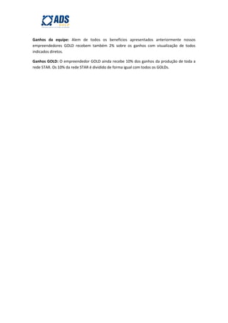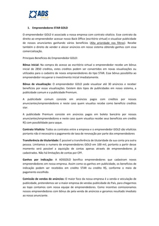Este documento descreve os benefícios de se tornar um empreendedor GOLD, incluindo um bônus inicial de 2850 créditos, a capacidade de visualizar até 30 anúncios por mês e receber créditos ou dinheiro por isso, e receber comissões por indicar novos empreendedores ou vender anúncios. Os empreendedores GOLD também recebem parte dos ganhos de sua equipe direta e indireta.