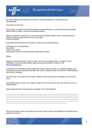 O documento apresenta um curso sobre empreendedorismo, discutindo o que é empreendedorismo, as características de um empreendedor, a importância do planejamento de metas e os mitos sobre empreendedores.