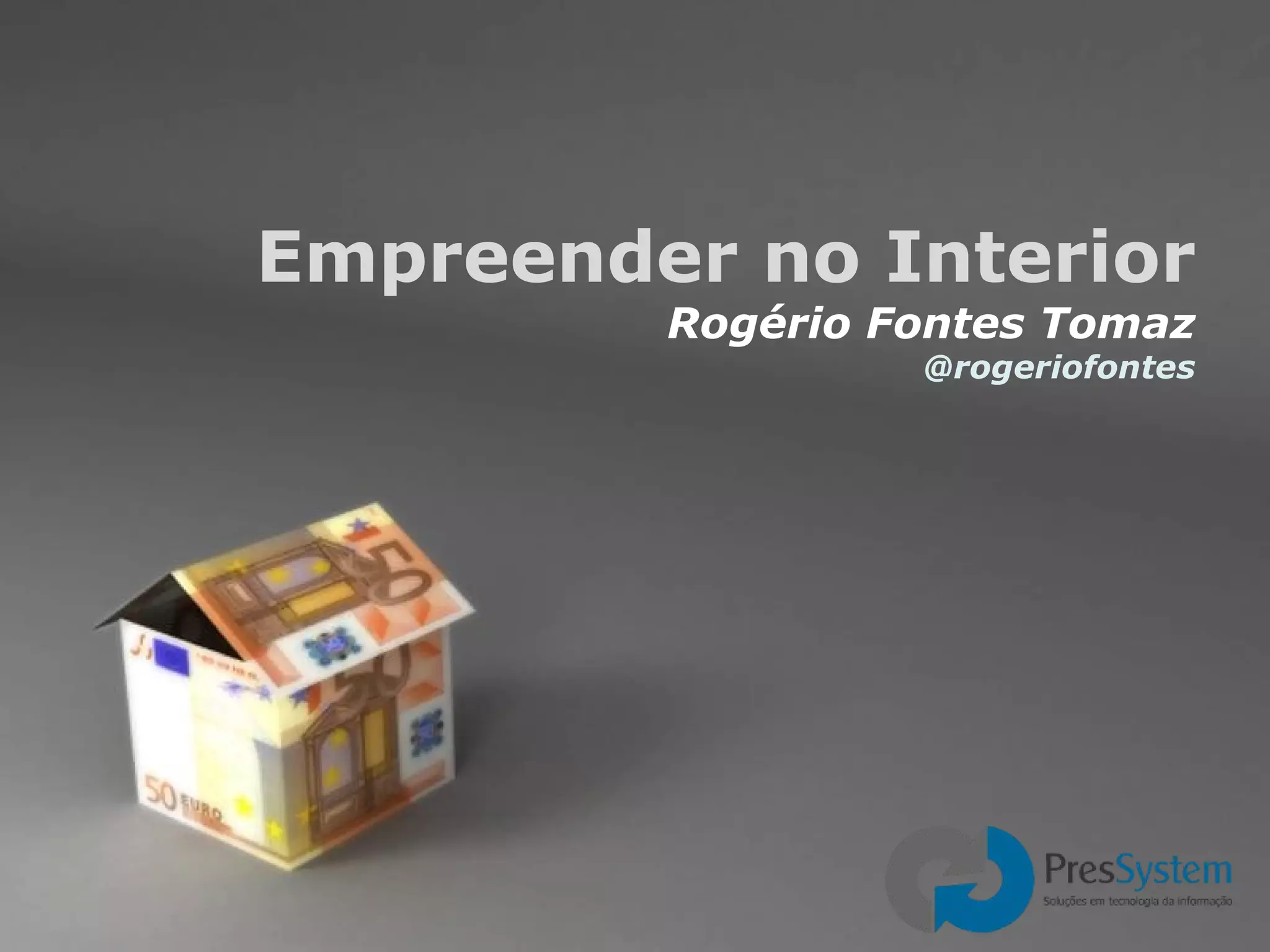 O documento descreve desafios e estratégias para empreender no interior de Minas Gerais, onde há muitas pequenas empresas dependentes de outras maiores e salários baixos. Recomenda trabalhar em outra empresa e usar horários livres para criar projetos próprios, evitando dívidas. Aconselha usar ferramentas ágeis e liberar versões de teste para ganhar receita com produtos diversos, inovando com paixão e persistência.