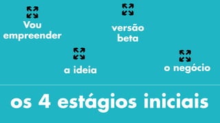 O documento discute as etapas iniciais de empreender, incluindo desenvolver uma ideia, testá-la em versão beta e lançar o negócio. Ele enfatiza a importância de pesquisar muito sobre a ideia, testá-la com clientes, ter competências fundamentais como gestão de pessoas e comunicação, e nunca desistir mesmo quando os problemas começarem.