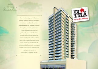 O documento descreve um novo empreendimento residencial chamado Varandas do Jardim localizado em Curitiba. O empreendimento possui 64 apartamentos com vista para o Jardim Botânico, além de lojas e salas comerciais. O documento destaca as áreas comuns e lazer do condomínio, como piscina, academia e salão de festas.