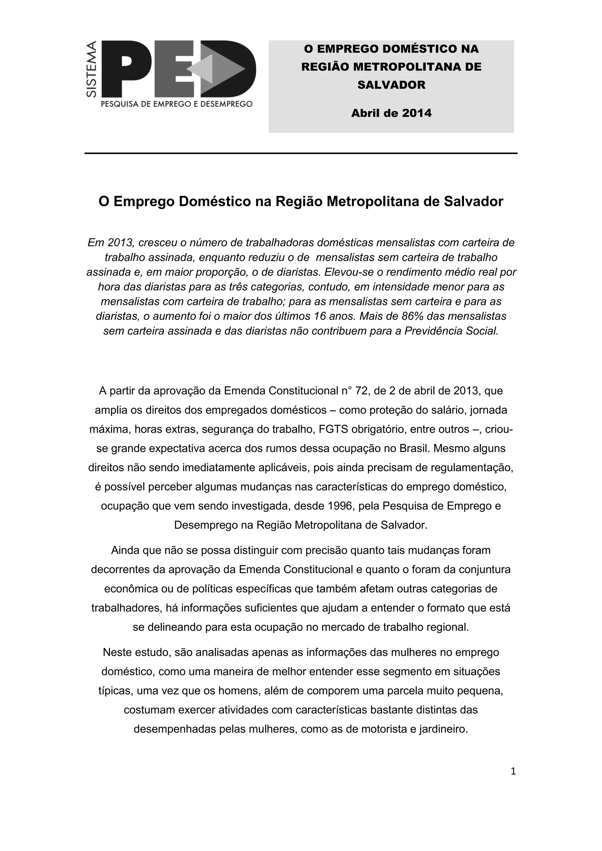Em 2013, o emprego doméstico na região metropolitana de Salvador apresentou crescimento no número de trabalhadoras mensalistas com carteira assinada, enquanto as diaristas e mensalistas sem carteira tiveram queda, especialmente após a aprovação da Emenda Constitucional nº 72. Embora a formalização e os rendimentos tenham aumentado, ainda é alta a porcentagem de trabalhadoras sem acesso a direitos previdenciários, com 86% das diaristas não contribuindo para a previdência. O aumento da escolaridade e da idade das trabalhadoras também marcou a evolução desse setor ao longo dos anos.