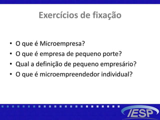 O documento discute as definições legais de microempresa, empresa de pequeno porte e microempreendedor individual no Brasil, incluindo seus limites de faturamento anual e benefícios tributários e trabalhistas conferidos por lei.