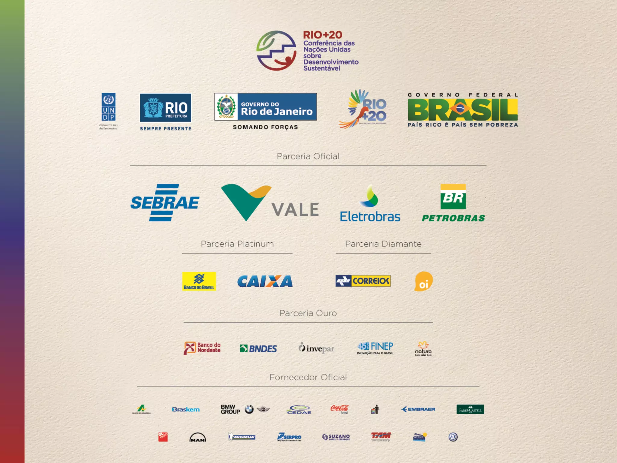 Comitê Nacional de Organização da CONFERÊNCIA RIO+20 Ministro Laudemar Aguiar Secretário Nacional Conselheiro José Solla Secretário Nacional Adjunto Suelma Rosa dos Santos Coordenadora de Captação e Desenvolvimento de Parcerias EQUIPE Coordenação de Captação e Desenvolvimento de Parcerias Adalberto Schiehll Adriana Micarelli Figueiredo Ana Lúcia Vigo Carlos Eduardo Pinto Tavares Danilo Oliveira Emanuel Coutinho Jr Gabriela Galvão Inês Lampreia Jaques Hanower Jasmim Madueno José Ronaldo Kampos Juliana Maria Lafetá Velloso Kyra Merz de Andrade Renata Campante Roberta Torres Rodrigo Montoni Sheila Guebara