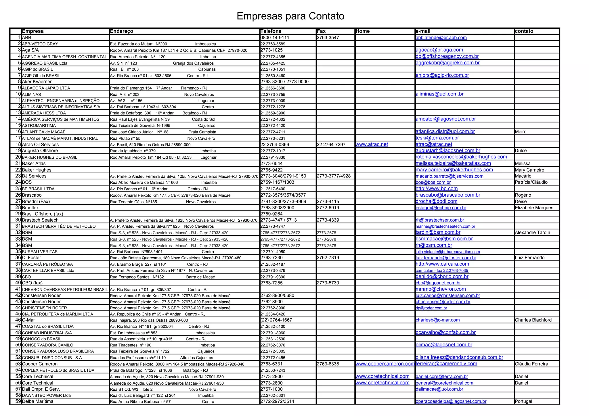 O documento contém uma lista abrangente de empresas com informações de contato, incluindo endereço, telefone, fax e e-mail. As empresas estão principalmente localizadas em Macaé e nas proximidades, abrangendo diversas indústrias. A tabela serve como um guia útil para contato profissional na região.