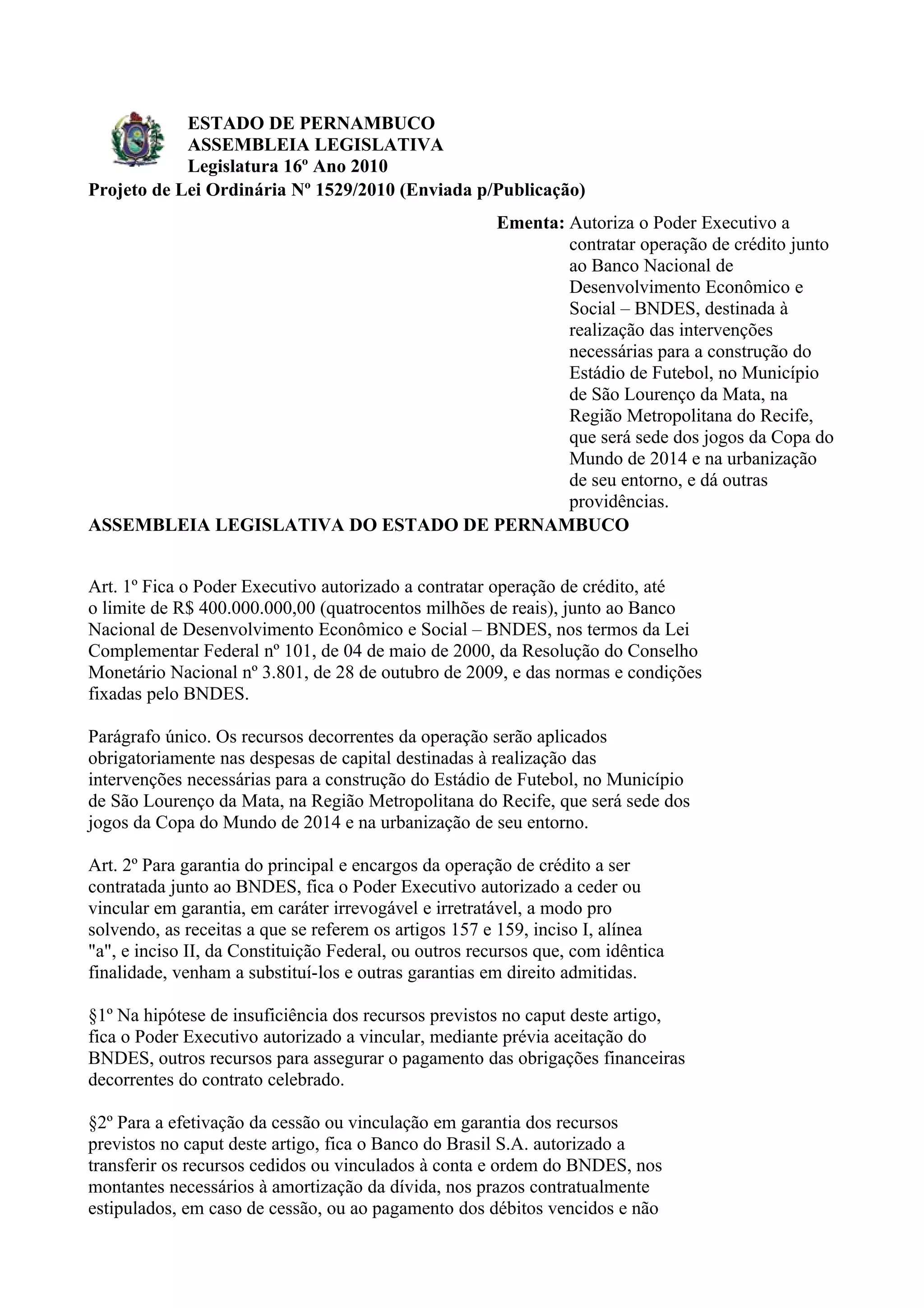 Este documento propõe uma lei que autoriza o governo de Pernambuco a contratar um empréstimo de R$400 milhões junto ao BNDES para construir um estádio de futebol em São Lourenço da Mata que sediará jogos da Copa do Mundo de 2014, e urbanizar a área ao redor.