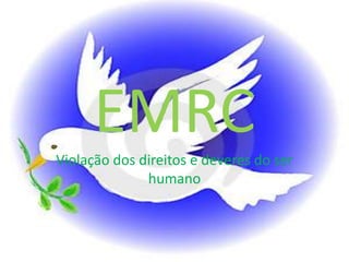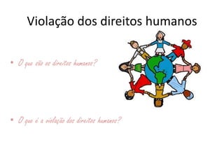 O documento discute violações dos direitos humanos. Primeiro, define direitos humanos e violações dos direitos humanos. Em seguida, descreve como Portugal vivia sob uma ditadura há 60 anos, onde não havia liberdade política e violência contra mulheres e crianças era aceitável. Apesar dos avanços sociais, ainda é importante discutir direitos humanos e vigiar as práticas para garantir que os direitos estejam protegidos.