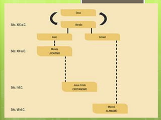 O documento descreve a história de Abraão, o patriarca das três principais religiões monoteístas: Judaísmo, Cristianismo e Islão. Abraão viveu no século XIX a.C. na Mesopotâmia e foi o primeiro a acreditar em um único Deus. Deus pediu que Abraão deixasse sua terra natal e ele confiou e obedeceu, tornando-se o fundador dessas fés que reconhecem um só Deus criador.