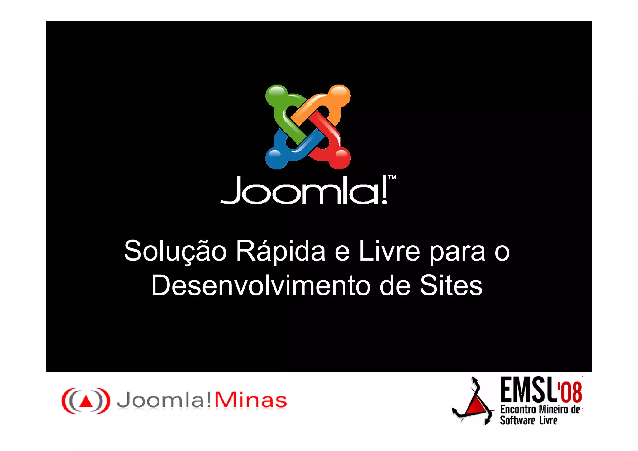 O documento discute o CMS Joomla, incluindo suas características como facilidade de uso, segurança, comunidade ativa e extensibilidade através de módulos, componentes e templates. Ele também lista exemplos de sites que usam Joomla e extensões populares.