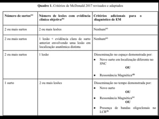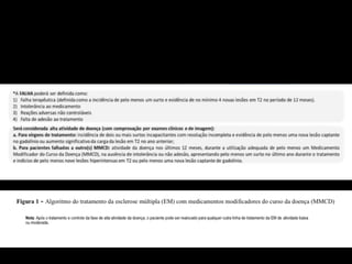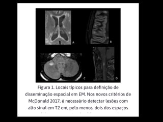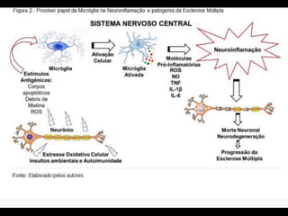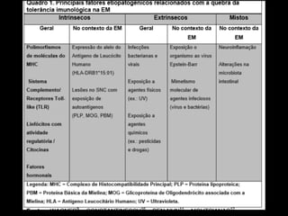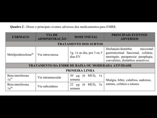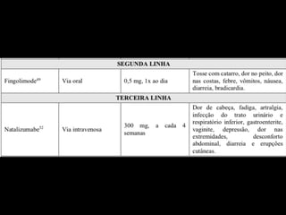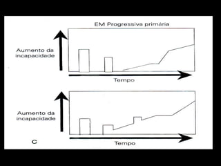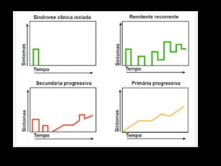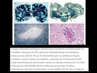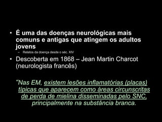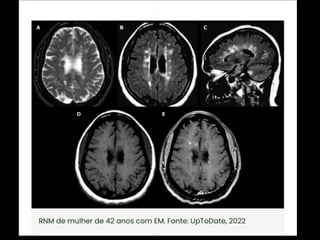 A Esclerose Múltipla é uma doença neurológica crônica que causa lesões inflamatórias na bainha de mielina do sistema nervoso central, comprometendo a comunicação entre os neurônios. Manifesta-se principalmente por surtos de sintomas neurológicos que variam entre indivíduos, podendo afetar a visão, sensibilidade, coordenação e função cognitiva. Sua causa exata é desconhecida, envolvendo fatores genéticos e ambientais.