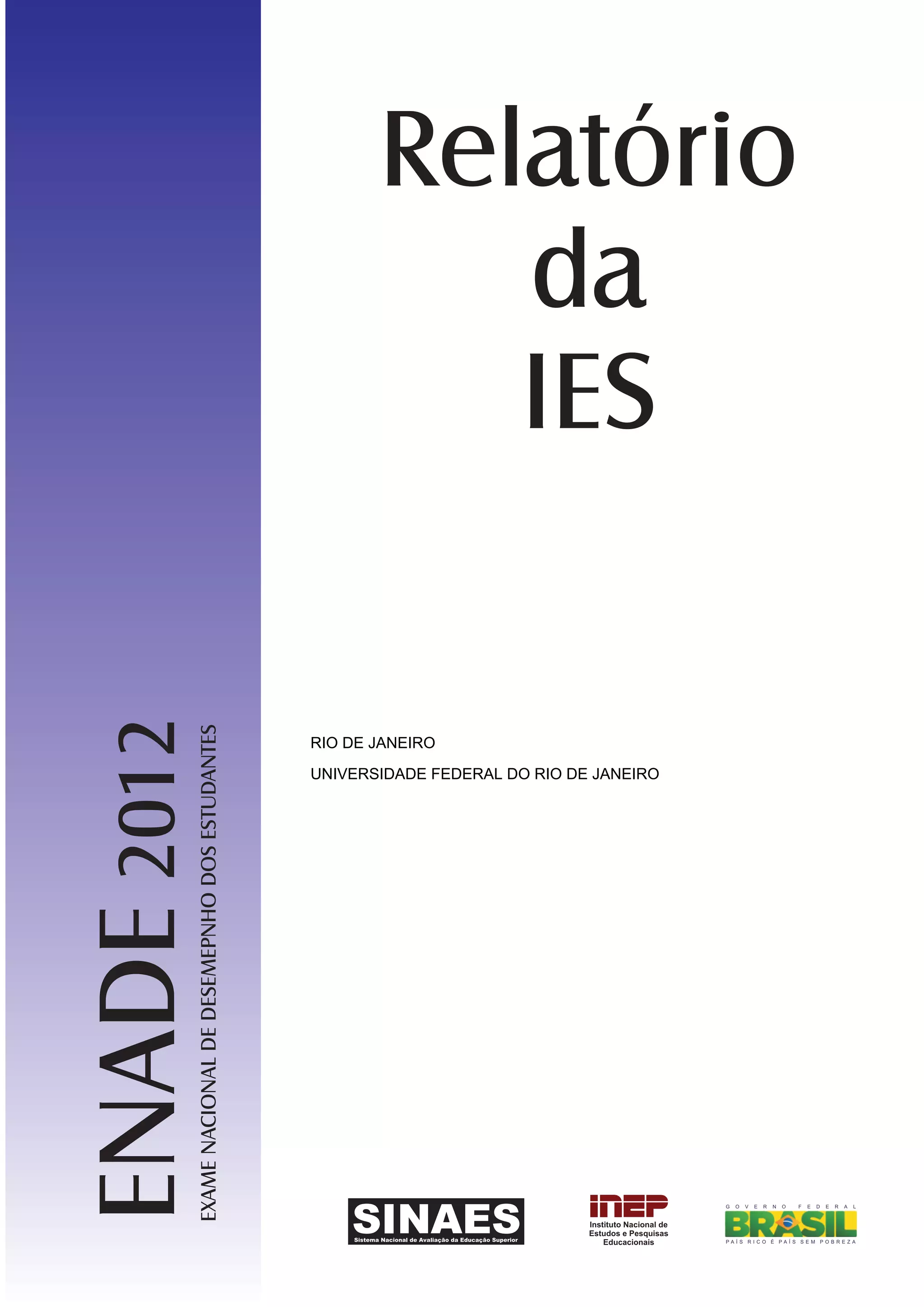 O relatório apresenta os resultados do ENADE 2012 da Universidade Federal do Rio de Janeiro no município do Rio de Janeiro. Os principais pontos são: