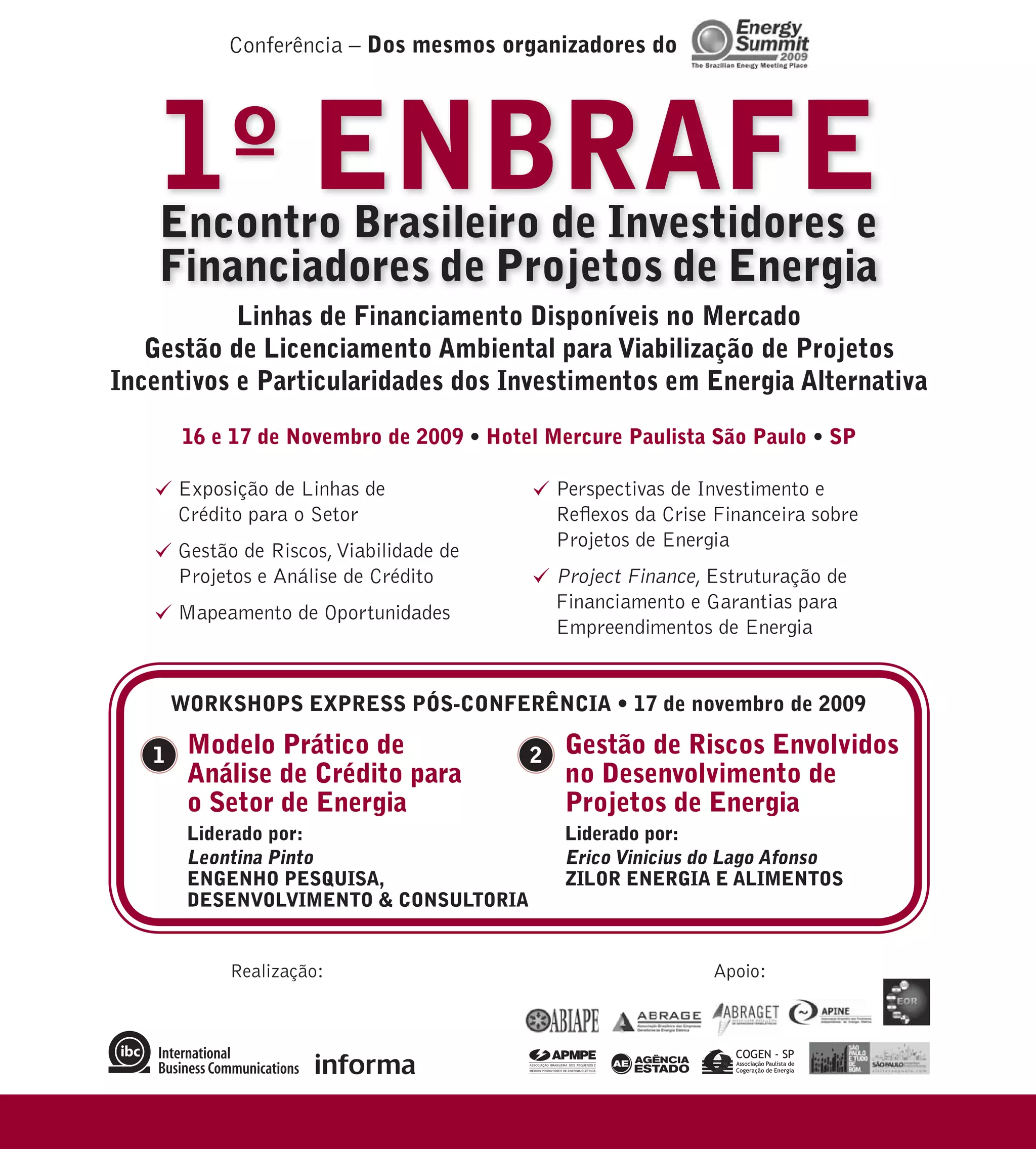 O documento anuncia o 1o ENBRAFE - Encontro Brasileiro de Investidores e Financiadores de Projetos de Energia, que irá reunir financiadores, empreendedores, geradoras e consumidores de energia para discutir o desenvolvimento do setor energético brasileiro. O evento ocorrerá nos dias 16 e 17 de novembro de 2009 e contará com palestras e painéis sobre linhas de financiamento, projetos de energia, licenciamento ambiental e incentivos para investimentos em energia alternativa.