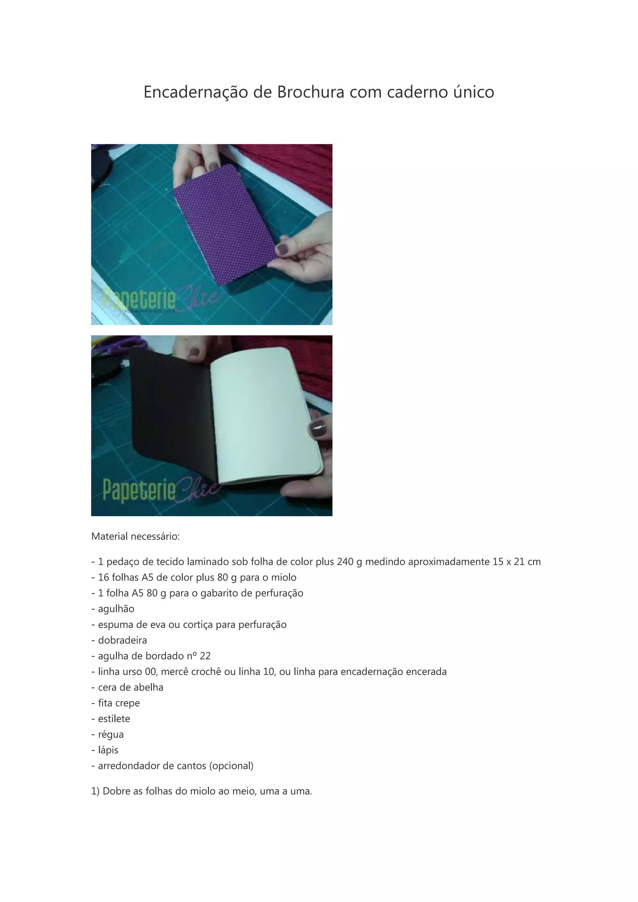 Este documento fornece instruções detalhadas para encadernar um caderno único com capa de tecido laminado. As etapas incluem dobrar e juntar as folhas em cadernos duplos, costurar o miolo com linha à capa de tecido, e refilar as bordas do caderno para dar o formato final.