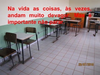 O documento encoraja as pessoas a continuarem se movimentando em direção aos seus objetivos, mesmo que de forma gradual, e a não desistirem, pois pequenos avanços constantes podem levar a grandes conquistas no futuro.