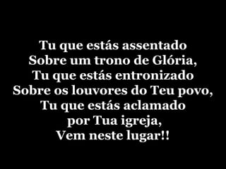 Tu que estásassentado Sobre um trono de Glória, Tu que estás entronizado Sobre os louvores do Teu povo, Tu que estás aclamado por Tua igreja, Vem neste lugar!!