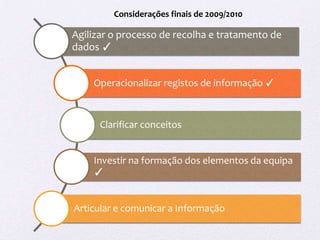 O documento resume o relatório de avaliação interna de 2010-2011 de um agrupamento de escolas, destacando: 1) A equipa de avaliação melhorou a recolha e tratamento de dados e a formação dos membros; 2) Foram analisados três domínios: projeto educativo, clima escolar e resultados académicos; 3) Os resultados mostraram uma redução de problemas disciplinares e taxas de transição estáveis/positivas.