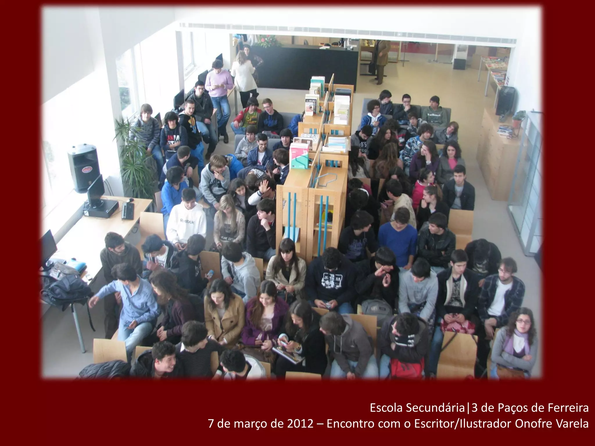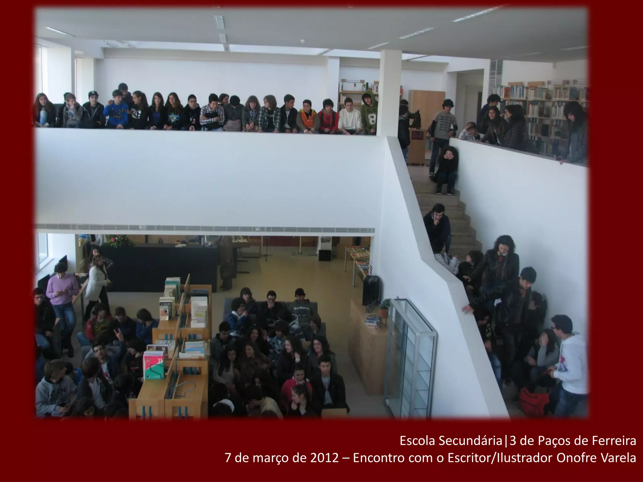 O documento descreve um encontro realizado na Escola Secundária 3 de Paços de Ferreira em 7 de março de 2012 com o escritor e ilustrador Onofre Varela.