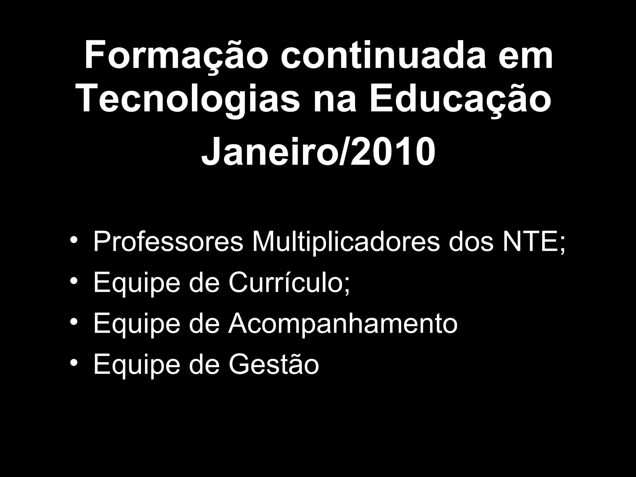 Formação continuada emTecnologias na Educação Janeiro/2010 Professores Multiplicadores dos NTE; Equipe de Currículo; Equipe de Acompanhamento Equipe de Gestão