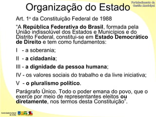 O documento discute a organização do Estado brasileiro e os princípios da democracia participativa no Brasil. Resume as seguintes informações essenciais: