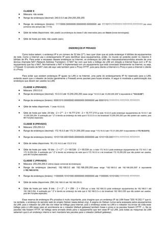 O documento descreve os conceitos de endereçamento IP, incluindo classes de endereços, máscaras de sub-rede, endereços privados e sub-redes. Explica que cada dispositivo de rede precisa de um endereço IP único para se comunicar, e que as classes A, B e C definem faixas de endereços e quantidades máximas de hosts por rede.
