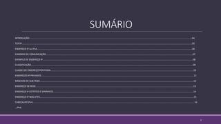 O documento introduz os conceitos básicos de endereçamento IP, incluindo IPv4 e IPv6. Aborda tópicos como classes de endereço IP, máscaras de sub-rede, endereços estáticos e dinâmicos, além de explicar a necessidade do IPv6 devido ao esgotamento de endereços do IPv4.