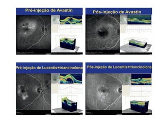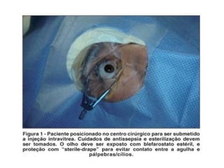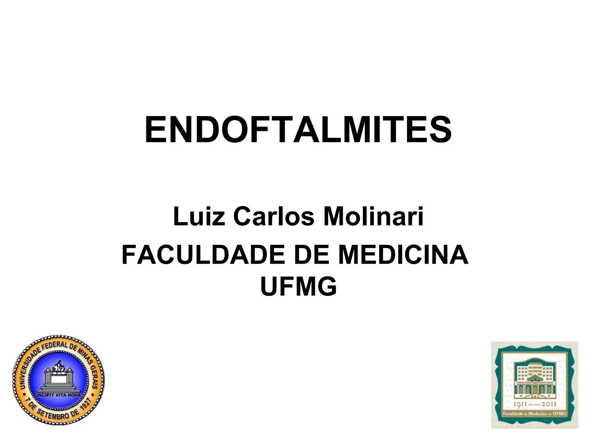 Este documento descreve a endoftalmite, uma inflamação intraocular grave causada por bactérias, fungos ou parasitas. Ele discute a classificação, sintomas, fatores de risco, exames e tratamento da endoftalmite pós-operatória aguda versus tardia, com foco no uso de antibióticos intravítreos como vancomicina e ceftazidima. O documento também aborda a endoftalmite fúngica e medidas para preveni-la.