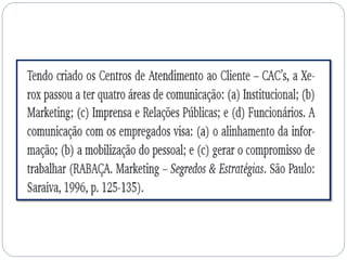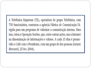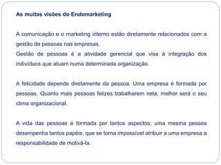 O documento discute os conceitos e objetivos do endomarketing, que é a comunicação e marketing interno de uma empresa. Ele explica que o endomarketing visa alinhar o pensamento dos funcionários aos objetivos estratégicos da empresa por meio da informação e integração. Também discute a importância da liderança e dos canais de comunicação interna para disseminar informações e motivar os funcionários.