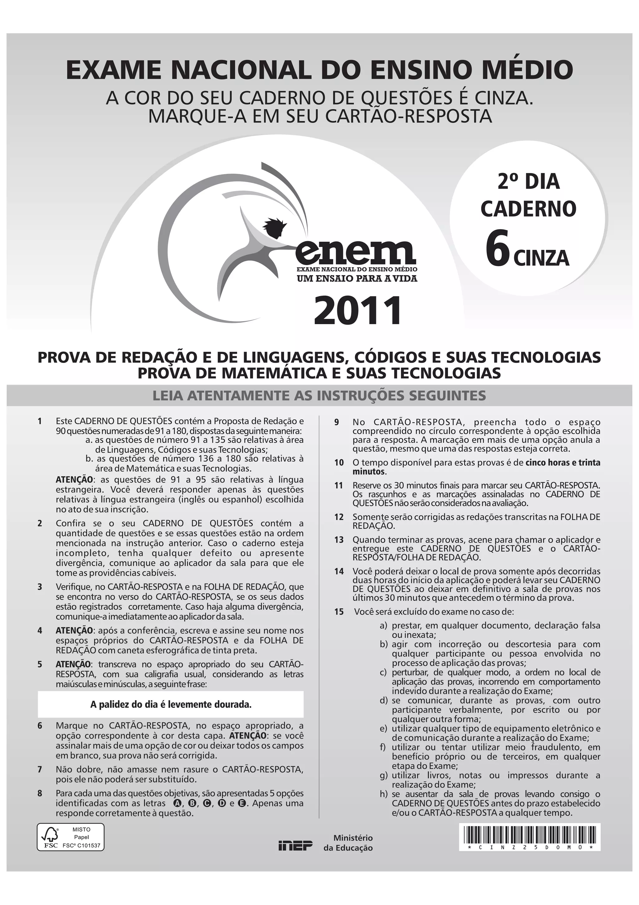 O documento fornece instruções sobre um exame nacional do ensino médio brasileiro. Ele inclui informações sobre a cor do caderno de questões, as áreas cobertas, as instruções para preencher o cartão de respostas, e o tempo disponível para a prova. Os alunos devem assinar seus nomes nos documentos apropriados e transcrever uma frase no cartão de respostas usando sua caligrafia usual. Eles devem marcar a cor da capa no cartão e não podem dobrar ou riscar o documento.