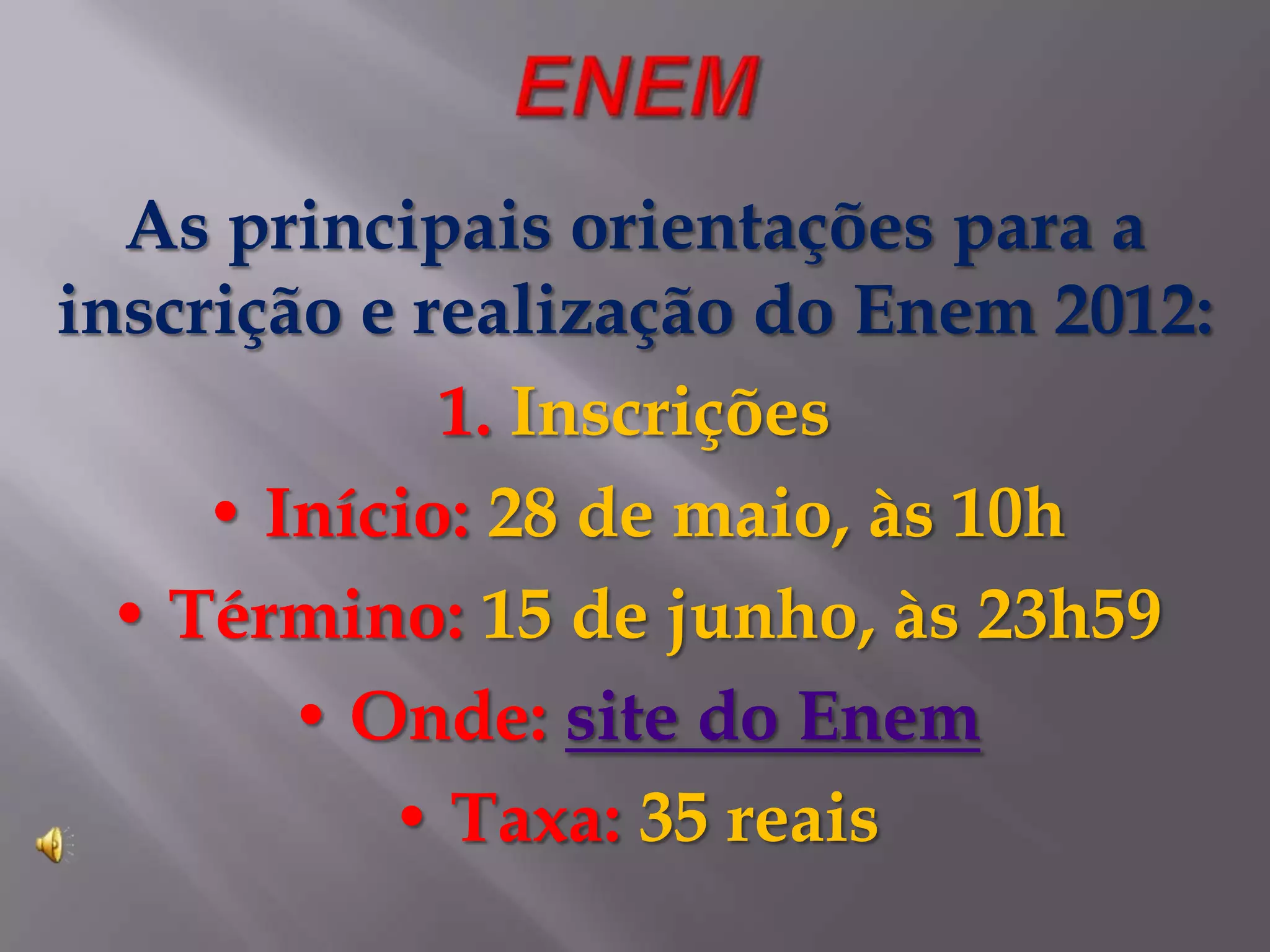 O documento fornece as principais orientações para a inscrição e realização do Exame Nacional do Ensino Médio (Enem) em 2012, incluindo datas de inscrição e provas, requisitos de elegibilidade, diretrizes para atendimento especial, itens permitidos e proibidos durante a prova, e como usar a nota do Enem para ingressar em programas de ensino superior.