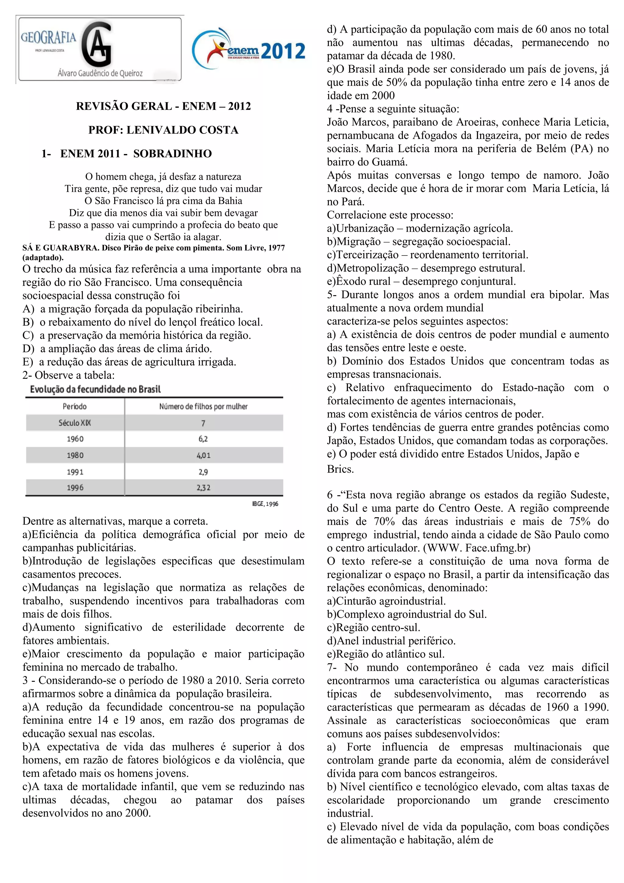 a) O documento discute temas relacionados à demografia, urbanização e desigualdades regionais no Brasil.