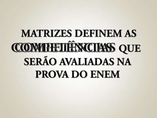 O documento descreve as habilidades e competências avaliadas pelo ENEM, incluindo nove competências nas áreas de linguagem, códigos e tecnologias. Cada competência inclui três ou quatro habilidades associadas que os estudantes devem demonstrar, como aplicar tecnologias de comunicação, usar línguas estrangeiras, compreender a arte e linguagem corporal.