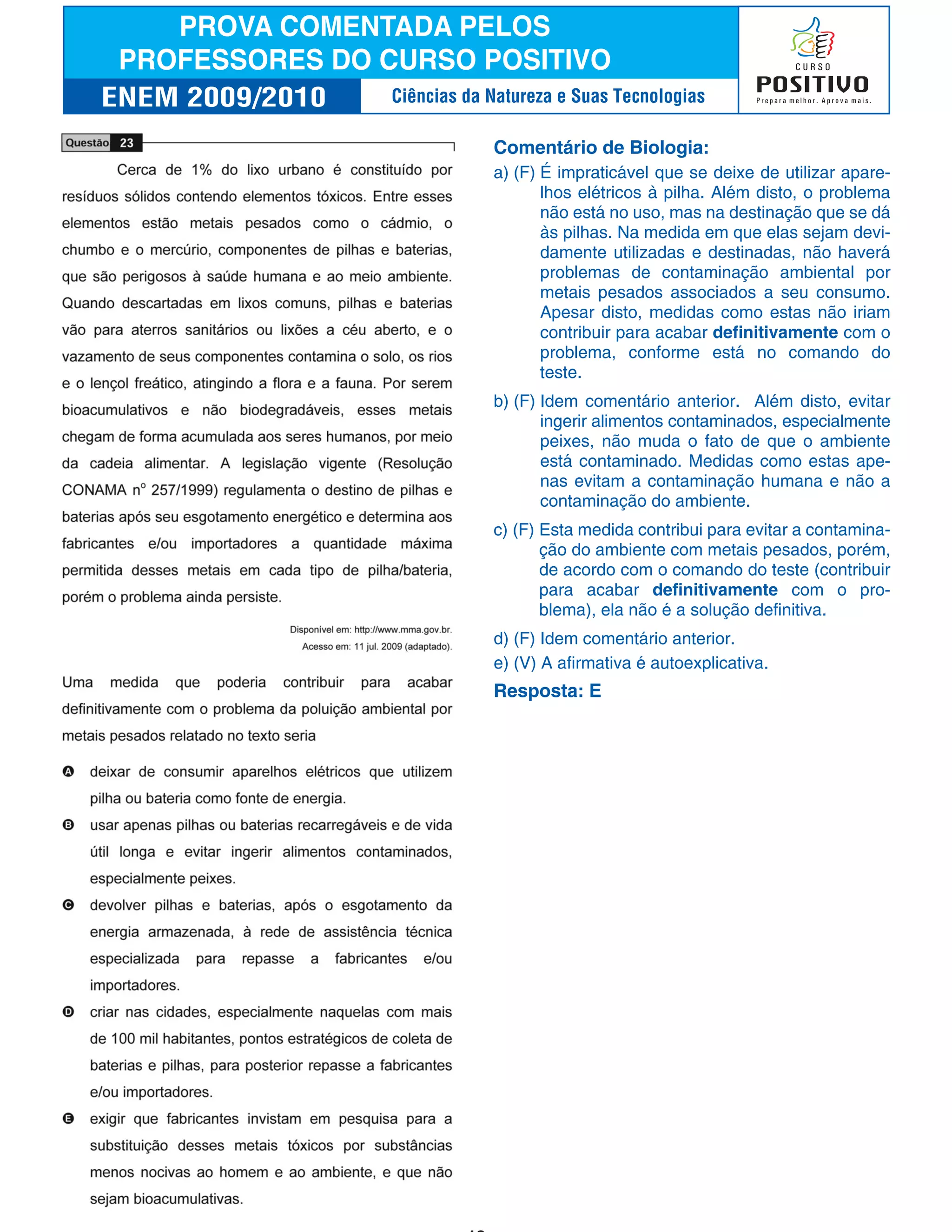 O documento discute cinco afirmações sobre medidas para reduzir a contaminação ambiental por metais pesados em pilhas. As afirmações a) e b) argumentam que evitar o uso de pilhas ou ingerir alimentos contaminados não resolveriam o problema definitivamente. A afirmação c) reconhece que evitar a contaminação ajuda, mas não é a solução definitiva. A afirmação e) é verdadeira de acordo com o texto.