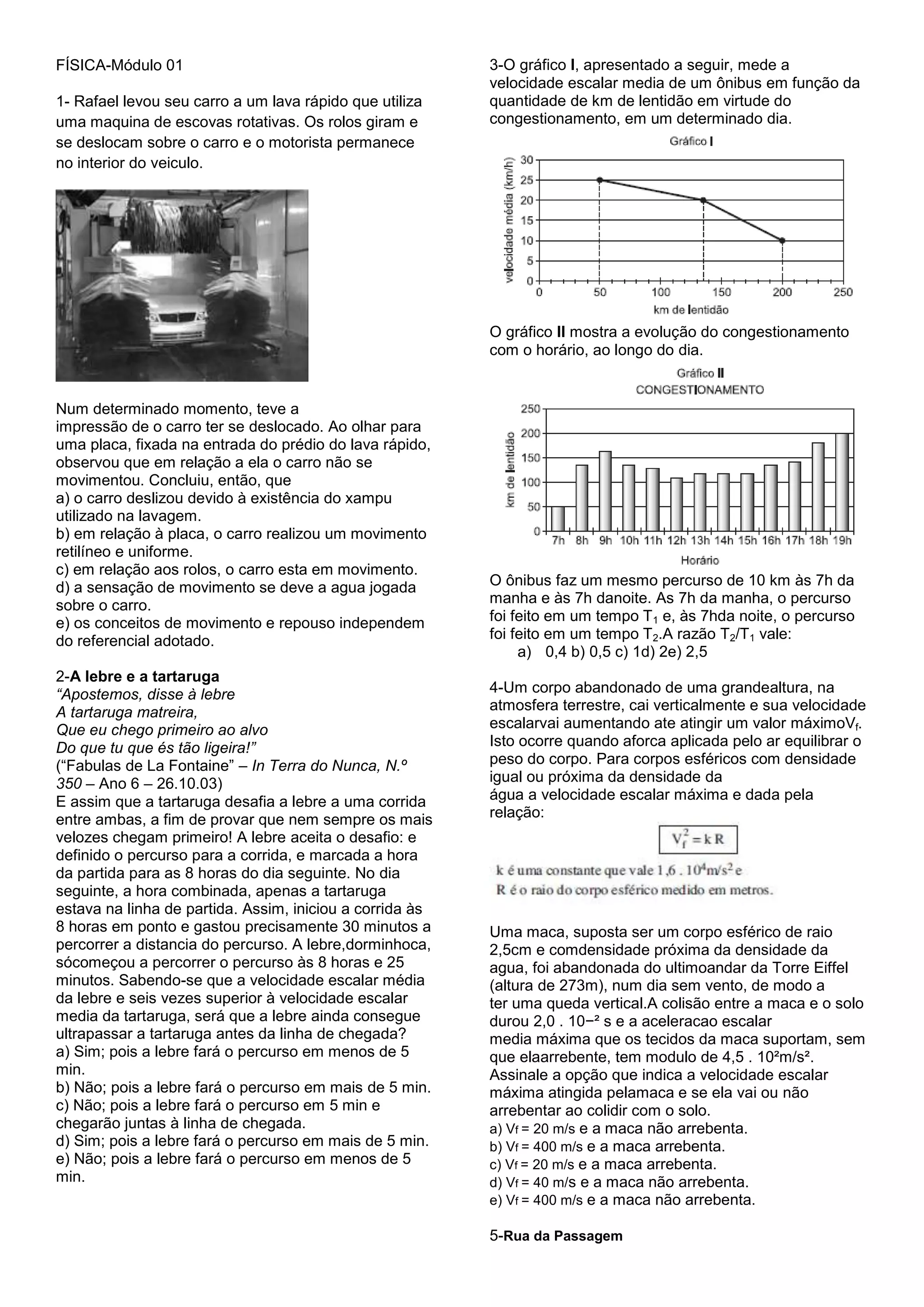 1) O documento discute um gráfico que mostra a velocidade média de um ônibus em função do congestionamento ao longo do dia e apresenta alguns problemas de física sobre movimento e velocidade.