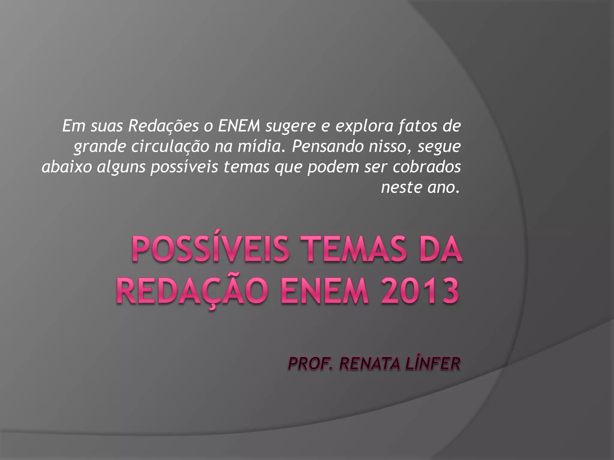 O documento lista possíveis temas que podem ser abordados na redação do ENEM em 2013, incluindo eventos políticos e sociais do ano como os protestos de junho, aniversários relacionados à Petrobras e à CLT, e questões energéticas e hídricas.