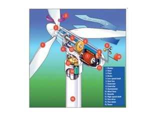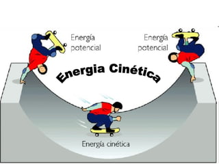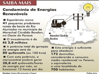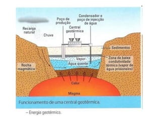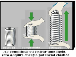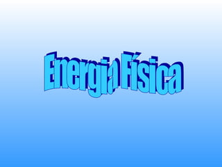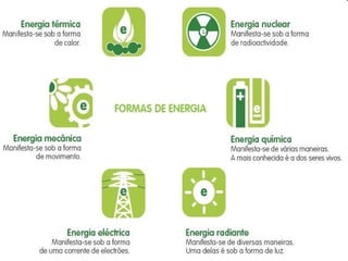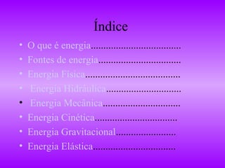 O documento fornece informações sobre diferentes tipos de energia, incluindo energia física, hidráulica, mecânica, cinética, gravitacional, elástica, nuclear, solar, eólica, geotérmica e renovável. Também discute energia elétrica, usinas termoelétricas e termonucleares, e como economizar energia.