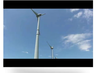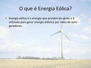 O documento discute a energia eólica, incluindo sua história, como funciona, vantagens e desvantagens. A energia eólica gera eletricidade usando aerogeradores movidos a vento, e tem se desenvolvido nos últimos 30 anos, com turbinas atingindo capacidades acima de 1 MW. Ela é renovável, não poluente e tem baixo custo, mas pode afetar paisagens, aves e causar ruído.