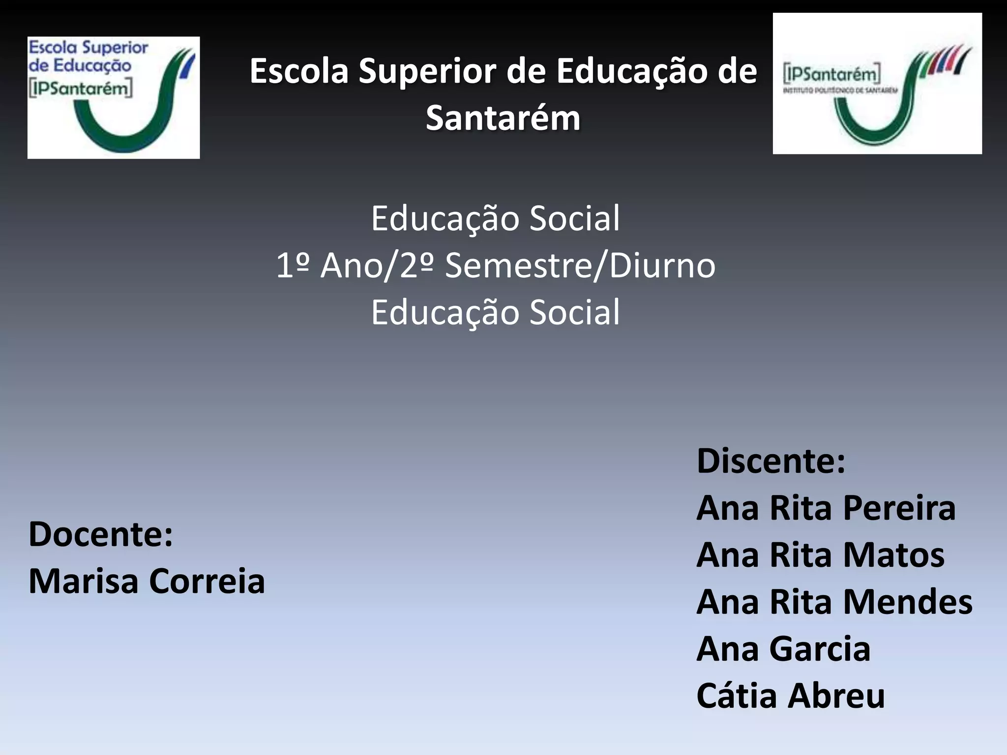 O documento é sobre um curso de Educação Social no 1o ano/2o semestre do turno diurno na Escola Superior de Educação de Santarém e lista a discente Ana Rita Pereira e os docentes Ana Rita Matos, Marisa Correia, Ana Rita Mendes, Ana Garcia e Cátia Abreu. Também inclui breves comentários sobre energia nuclear, reatores nucleares, fusão nuclear e riscos reduzidos com novas medidas de segurança.