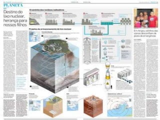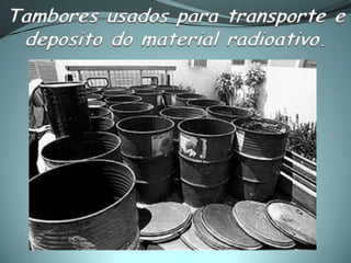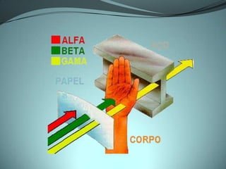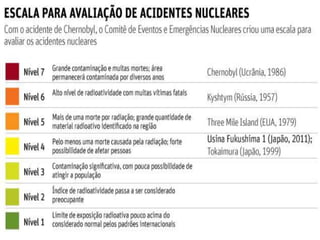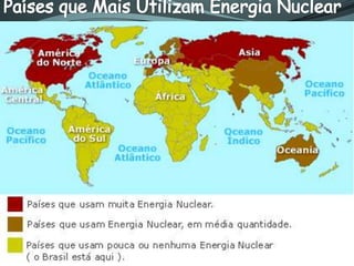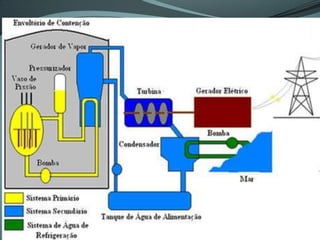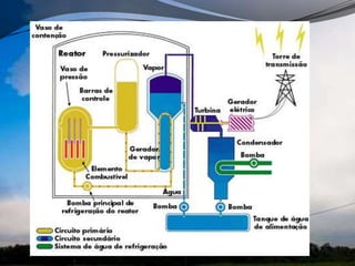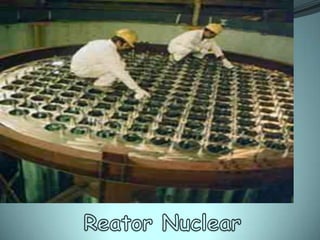 O documento descreve a história da descoberta da energia nuclear, incluindo a descoberta dos raios-X por Roentgen, a descoberta da radioatividade por Becquerel e Curie, e a descoberta das radiações alfa, beta e gama. Também discute os processos de fissão e fusão nuclear e o desenvolvimento da energia nuclear para geração de energia em usinas nucleares.