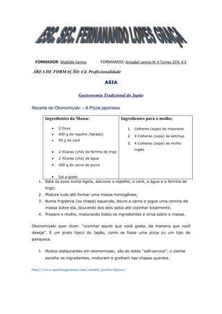 O documento apresenta receitas típicas da gastronomia de diferentes países ao redor do mundo, incluindo Arroz com Damasco da Arábia Saudita, Okonomiyaki do Japão, Nachos Calientes do México, Camarão à New Orleans dos Estados Unidos, Cazuela de Ave do Chile e Moqueca de Peixe do Brasil. As receitas fornecem ingredientes e instruções passo a passo para preparar os pratos tradicionais de cada região.