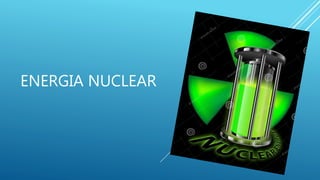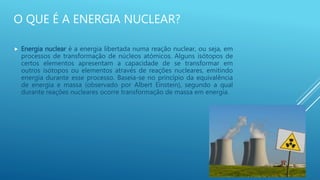 A energia nuclear é produzida por reações nucleares que libertam energia. Pode ser obtida através da fissão ou fusão nuclear de átomos. Apresenta vantagens como pequena área necessária e desvantagens como resíduos radioativos e riscos de acidentes. É usada em centrais elétricas e aplicações médicas e pode ter um papel importante no futuro da energia.