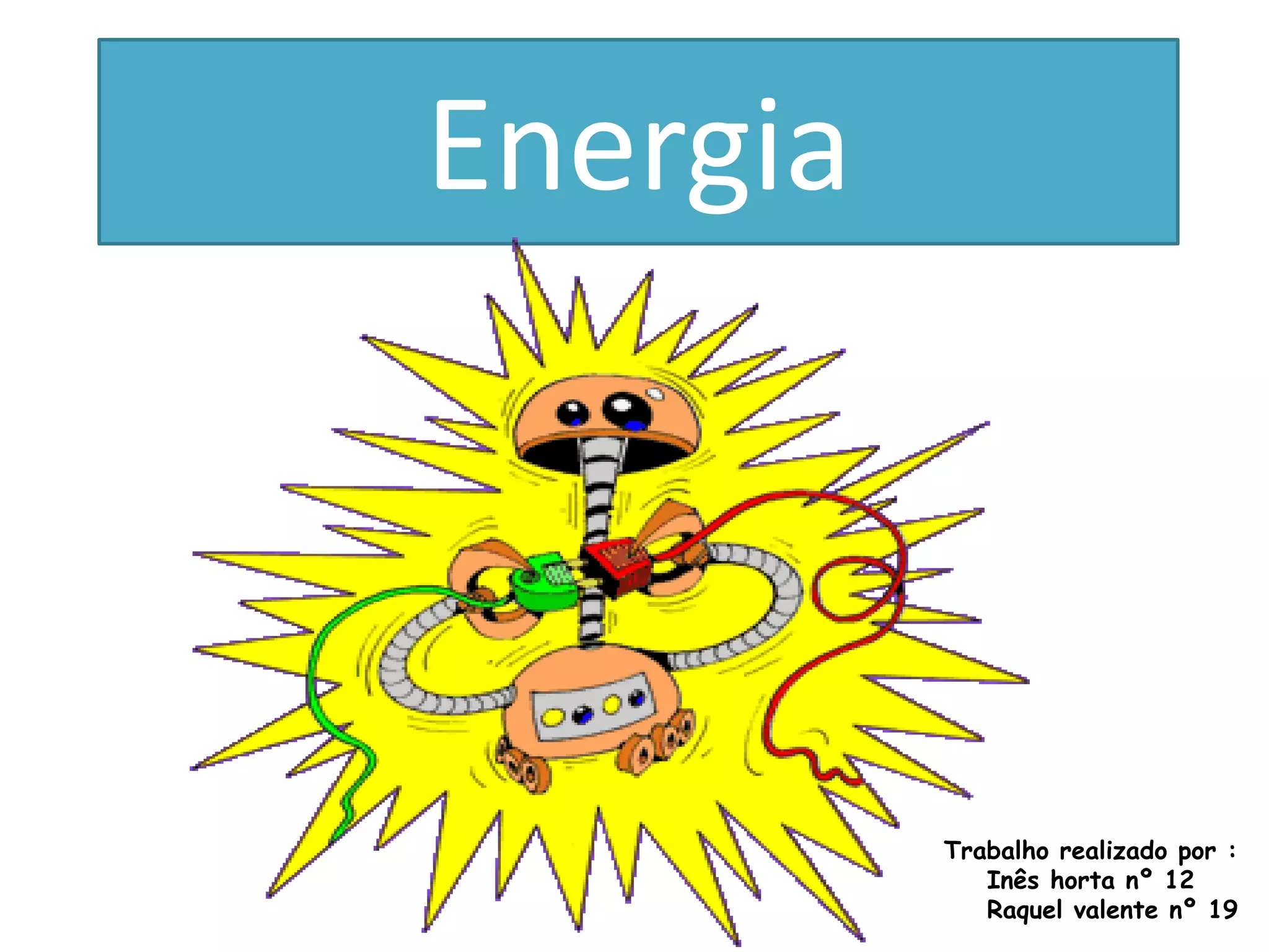 O documento discute os tipos de energia, incluindo luz, som, calor, energia elétrica, solar, potencial, cinética, mecânica, hidrelétrica, química e nuclear. Ele explica que a energia pode ser produzida por fontes como carvão, petróleo, gás, vento e água e é usada para iluminar e aquecer casas. As formas mais importantes de energia no dia-a-dia são a energia elétrica, solar e nuclear.