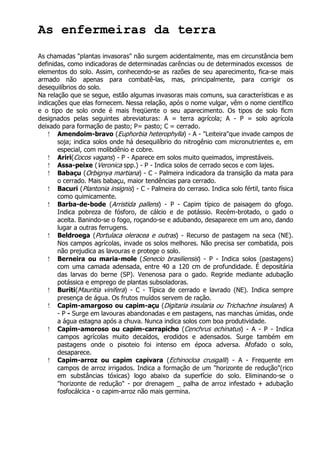 O documento lista diversas plantas consideradas invasoras e explica o que cada uma indica sobre as condições do solo, como deficiências de nutrientes, acidez, compactação ou presença de camadas impermeáveis. Menciona que conhecendo as razões do aparecimento dessas plantas, fica-se mais apto a corrigir os desequilíbrios do solo, não apenas combatendo as invasoras.