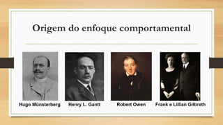 O documento discute o enfoque comportamental na administração, que tem duas áreas principais de estudo: 1) as características individuais das pessoas e 2) o comportamento coletivo em grupos e organizações. O enfoque surgiu de movimentos como sindicatos, utopistas, Marxismo e a Igreja para melhorar as condições de trabalho.