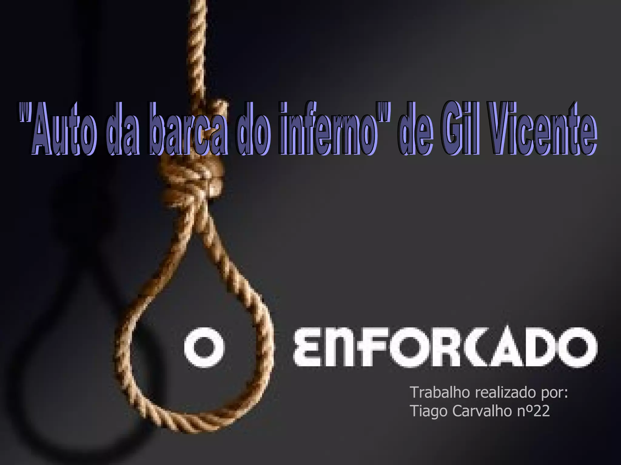 O documento resume o enredo do "Auto da barca do inferno" de Gil Vicente. Um enforcado é condenado a embarcar na barca do inferno devido aos seus pecados. Ele alega sua defesa baseado nas palavras de Garcia Moniz, mas é acusado de ser ladrão e suicida. No final, Gil Vicente critica aqueles que usam seu poder para enganar os mais fracos.