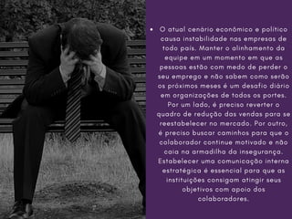 O documento discute a importância da comunicação interna estratégica nas empresas durante períodos de instabilidade econômica e política. Ele explica que manter os funcionários motivados e alinhados é essencial para que as empresas alcancem seus objetivos e sugere que a comunicação por meio de redes sociais, aplicativos e vídeos pode ajudar a reduzir a ansiedade dos funcionários e aumentar o engajamento.