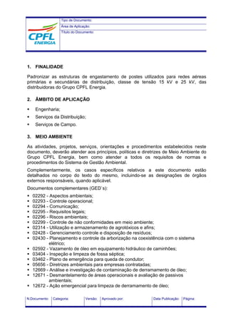1. O documento padroniza estruturas de engastamento de postes para redes elétricas de distribuição de 15 kV e 25 kV do Grupo CPFL Energia, definindo tipos de engastamento, dimensões e especificações técnicas.